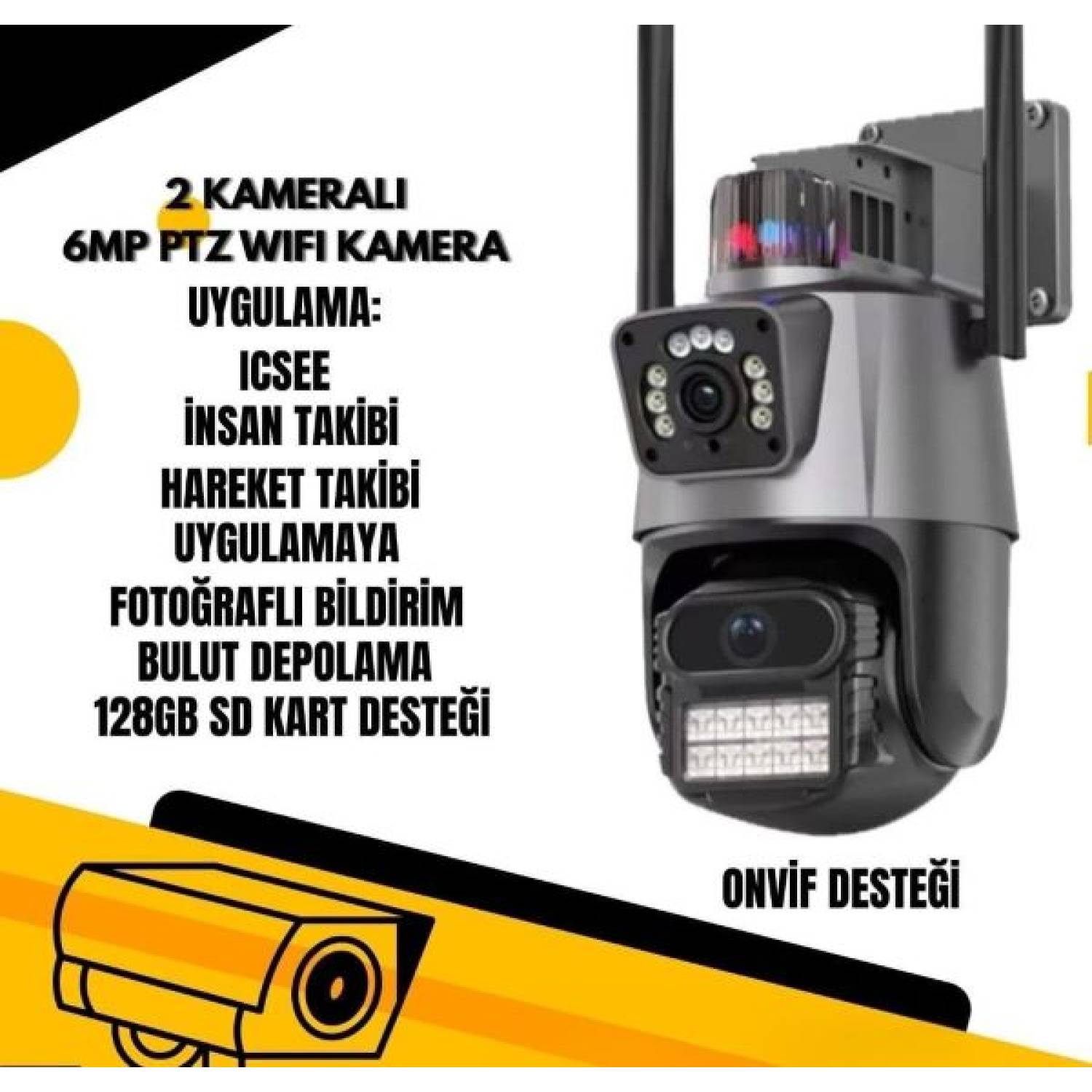 Tek kamerası ptz kamera olan iki kameralı ptzli wifi kamera her lensinde 3 mp çözünürlüğe sahiptir.