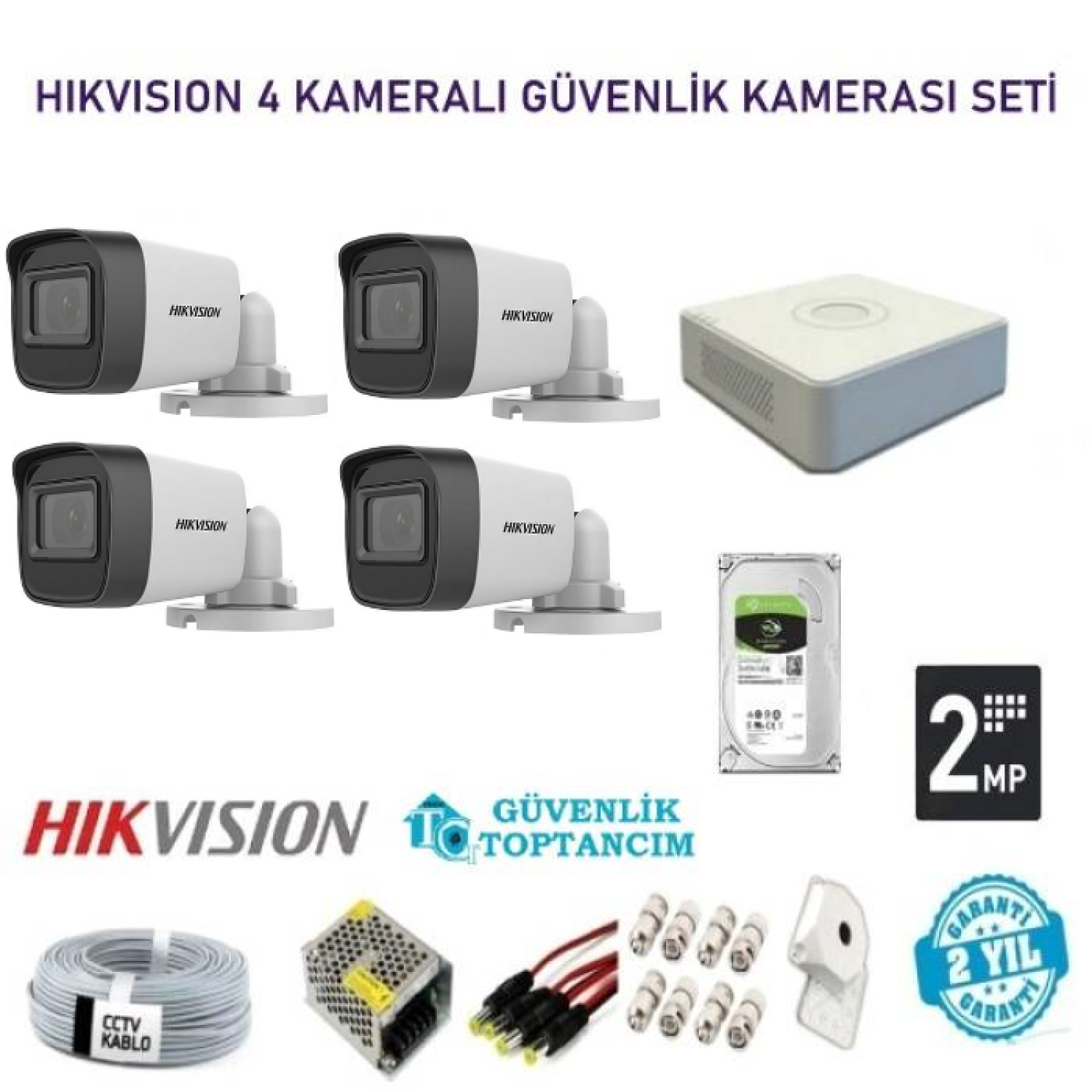 Hikvision 2 mp güvenlik kamerası seti, 4 dış mekan kameralı 500 gb güvenlik diski dahil, 2 mp 1080p net görüntü verirken net gece görüşü sunar.